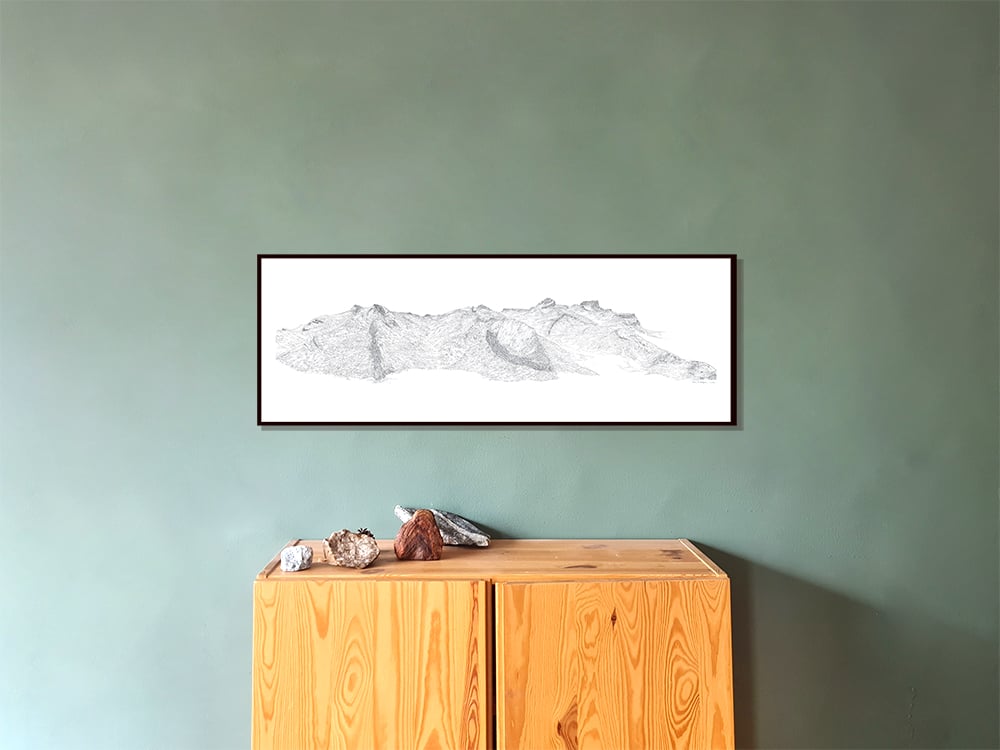 L'impression est disponible semblable à l'original - dessin seul - ou avec indication des noms et altitudes des différents sommets.